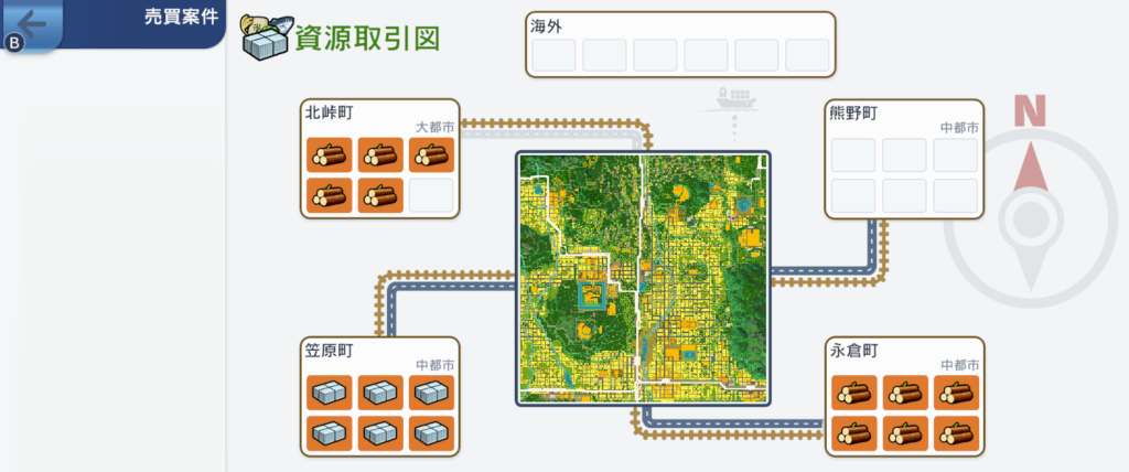 • 資材 →南にある咲久町の資材工場2から、 西の町(笠原町)へトラック輸送
